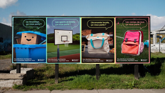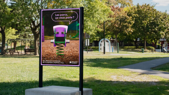 Cette idée d’un municipal parlant, on l’a déclinée dans tous les formats – vidéo, radio, affichage, imprimé, bannières Web – donnant vie à une campagne 360 ludique et colorée. Dans le cadre d’un coup d’éclat destiné aux réseaux sociaux, on a même fait parler des installations municipales dans la vraie vie, avec la complicité de l’humoriste Michelle Desrochers en coulisses.
